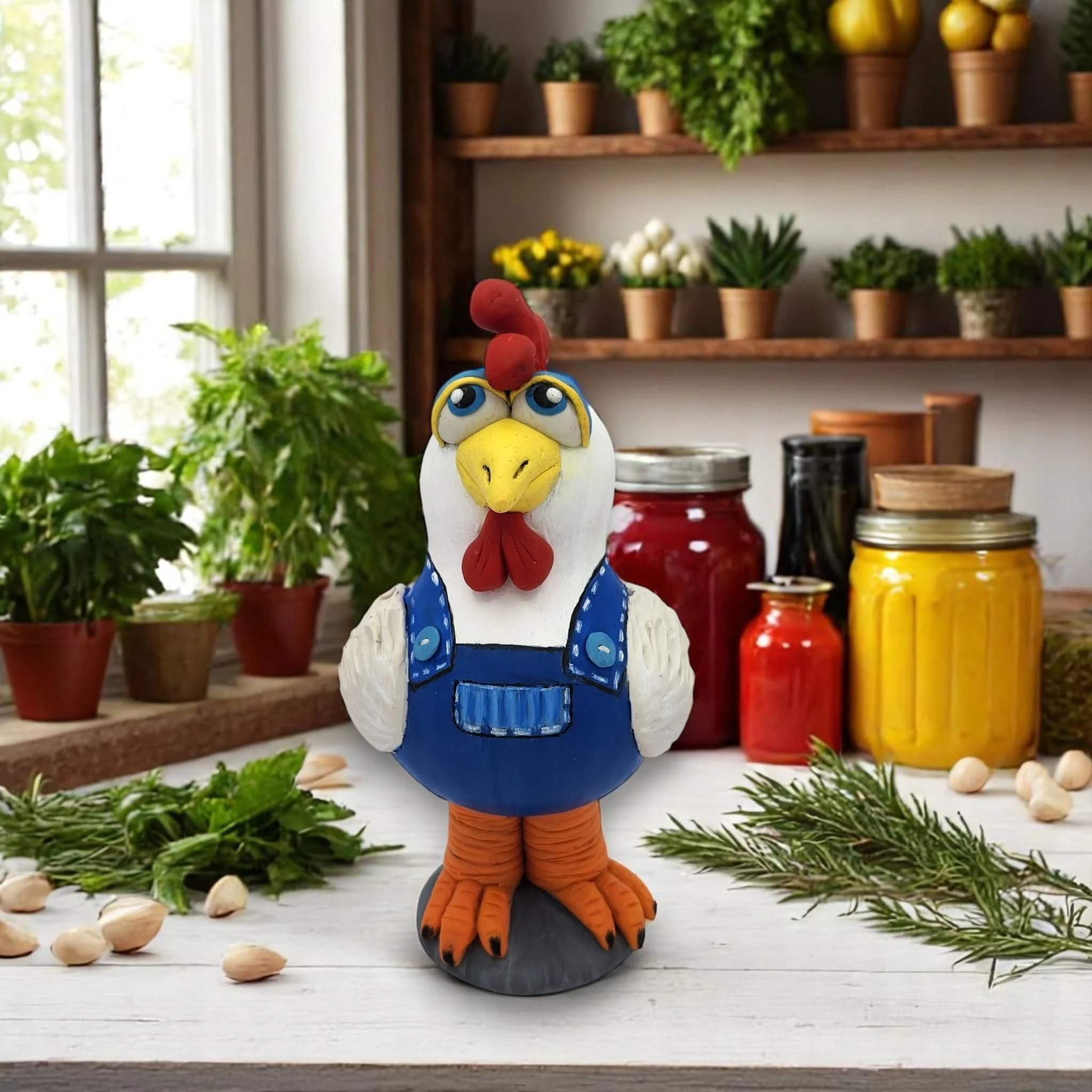 A Polymer Clay & Gourd Chicken displays a delightful, handcrafted fowl donning blue overalls, complete with a vivid red comb and wattles. The meticulously detailed sculpture stands on a wooden surface, amidst a playful array of condiments, turning it into a kitchen scenes eye-catching centerpiece.