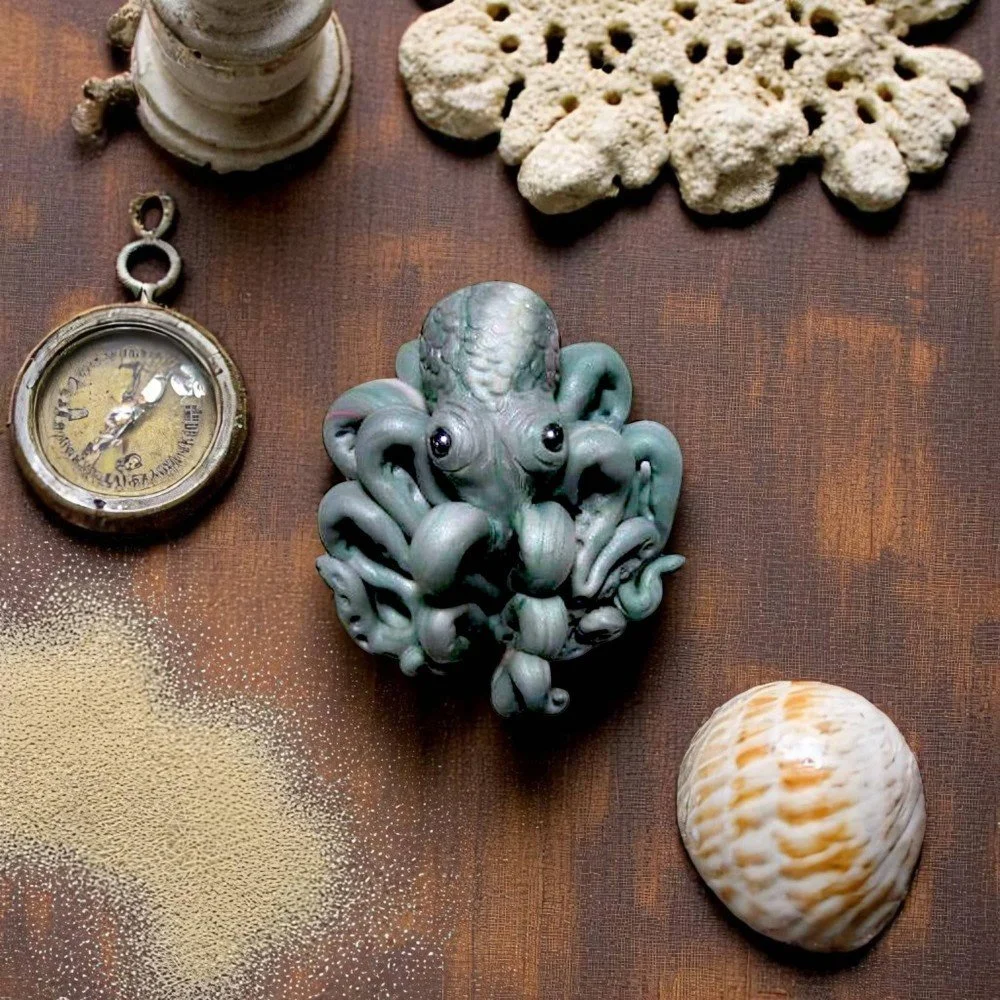 A hand sculpted polymer clay octopus paperweight displays a captivating creation or greys and pearl white in its texture. The octopus with whimsical lifelike features and a glossy black inset eyes is a harmonious blend of clay and rustic charm with the nautical scenery elevates this visual masterpiece.