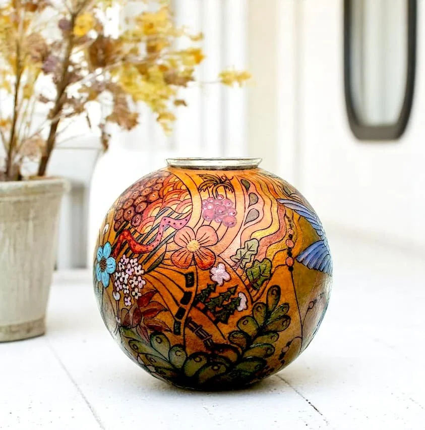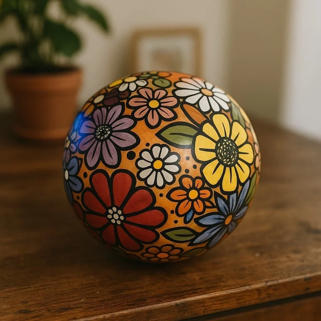 An original digital art piece created by Warwick Arts. This handcrafted Floral Gourd Ball features vibrant hand-painted flowers, sealed for durability. A unique decorative accent, perfect for rustic or garden-inspired spaces.