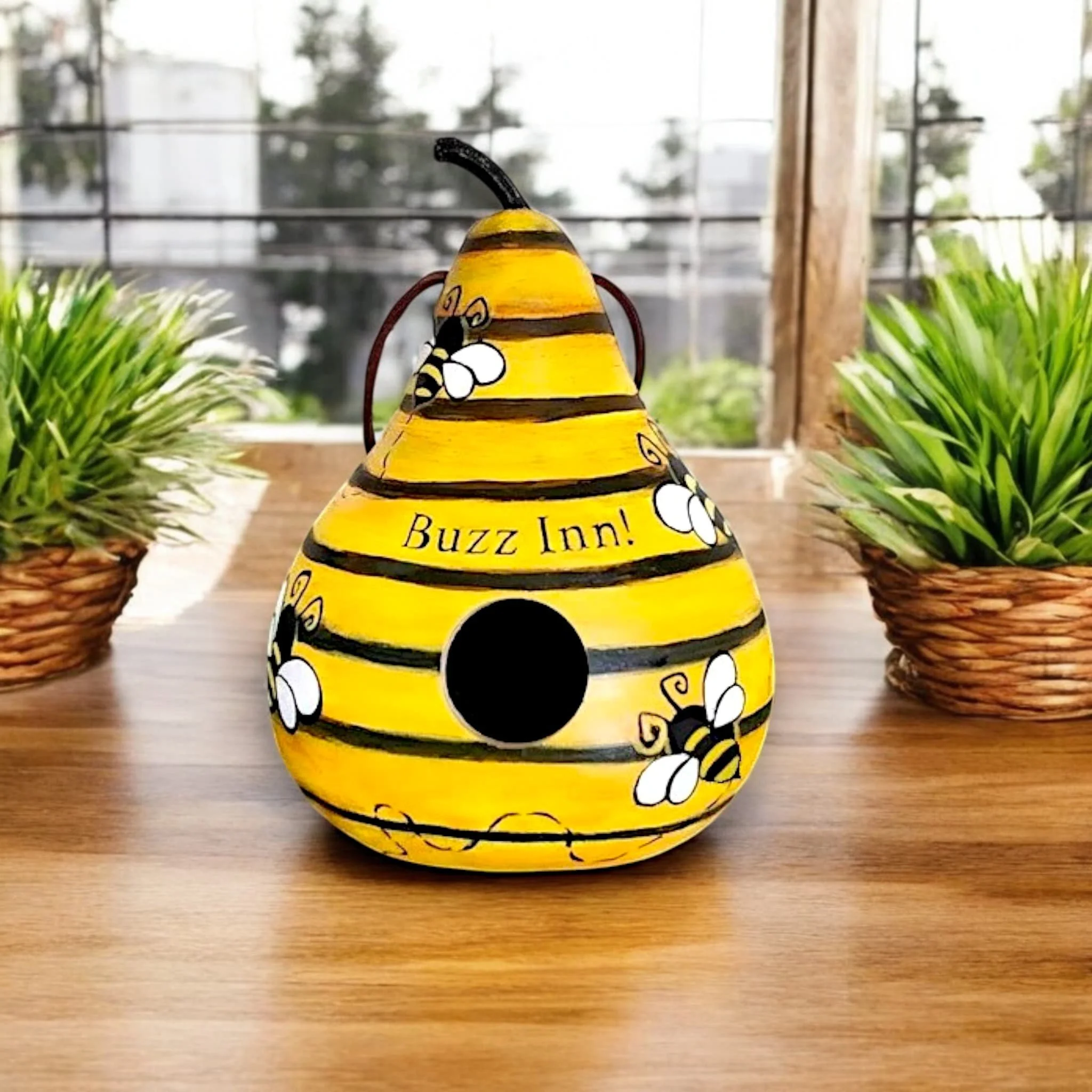 "Buzz Inn", hand painted with a whimsical beehive design with playful cartoon bees. A sweet addition to any garden.