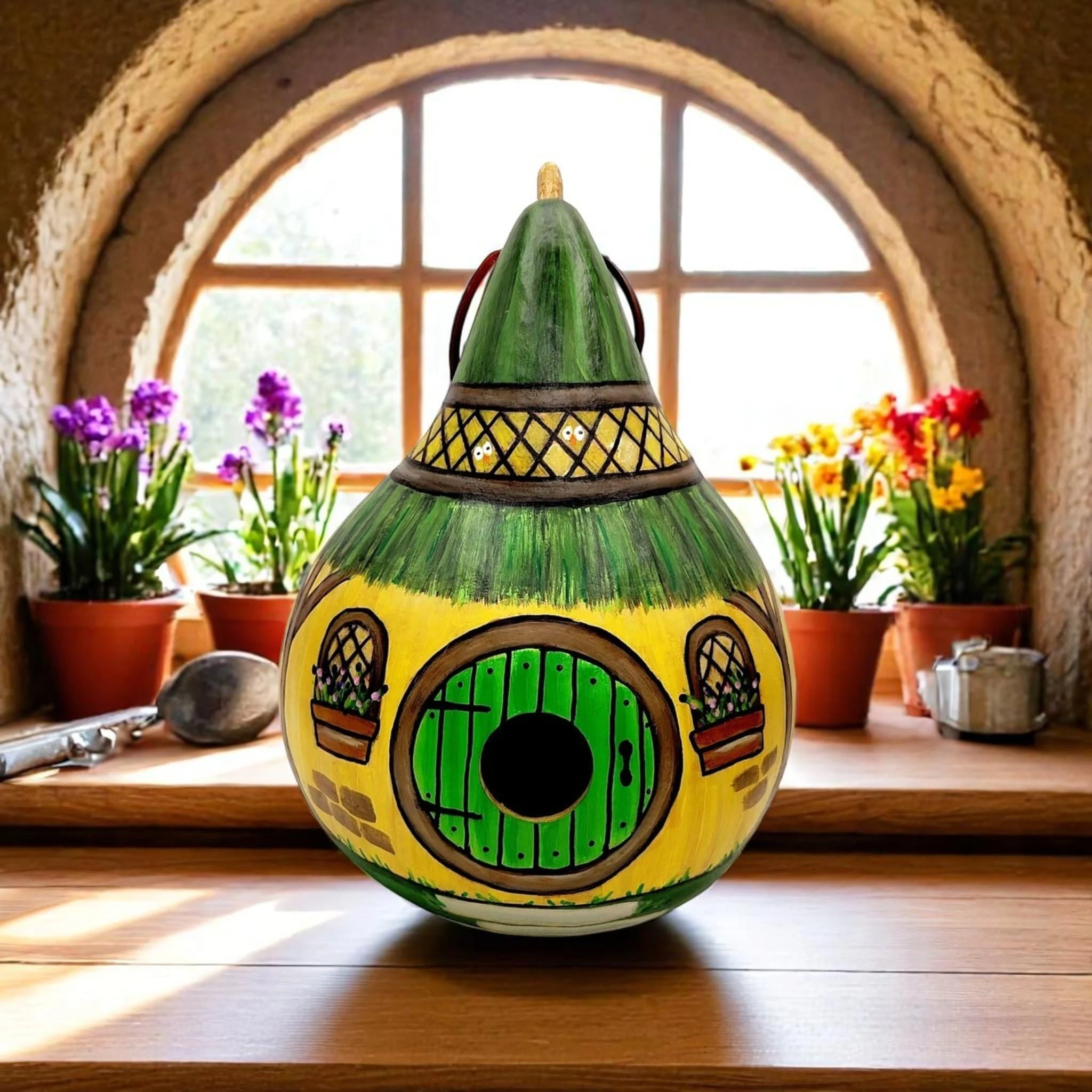Decorative gourd birdhouse painted like a whimsical hobbit cottage with a green roof, round door, and windows, surrounded by flowers.