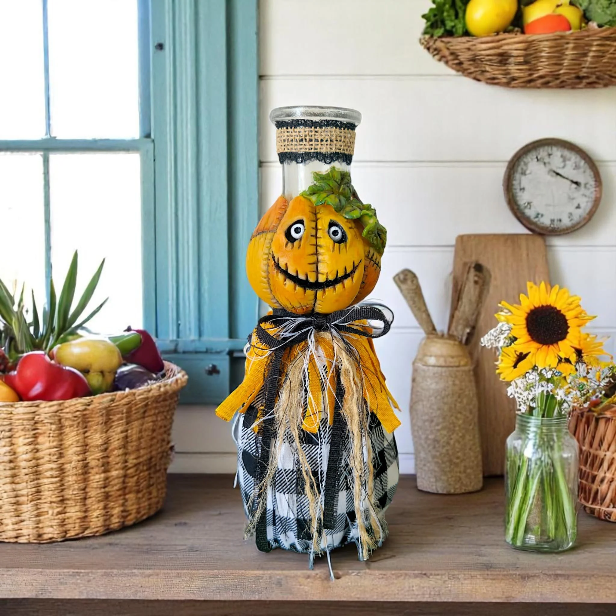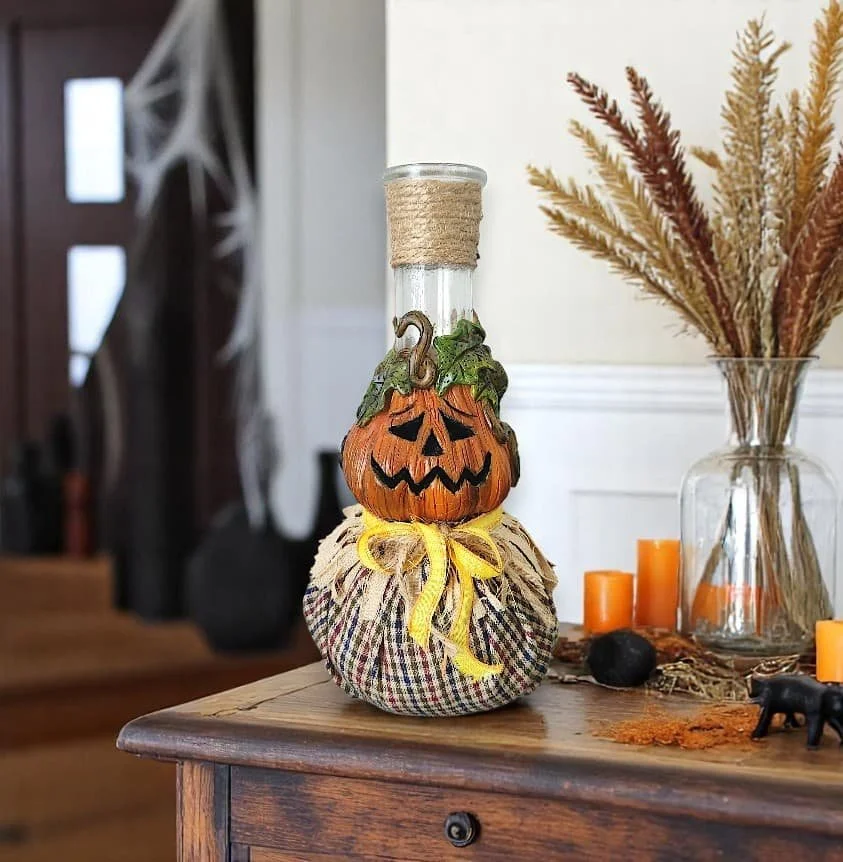 A Hand sculpted Polymer Clay Jack-o-lantern floral vase displays a captivating fusion of art and nature. The intricate jack-o-lantern design, skillfully crafted by hand, is adorned with delicate leaves and vines atop its head, creating a one-of-a-kind centerpiece. Its elegance and whimsy elevate any festive setting.