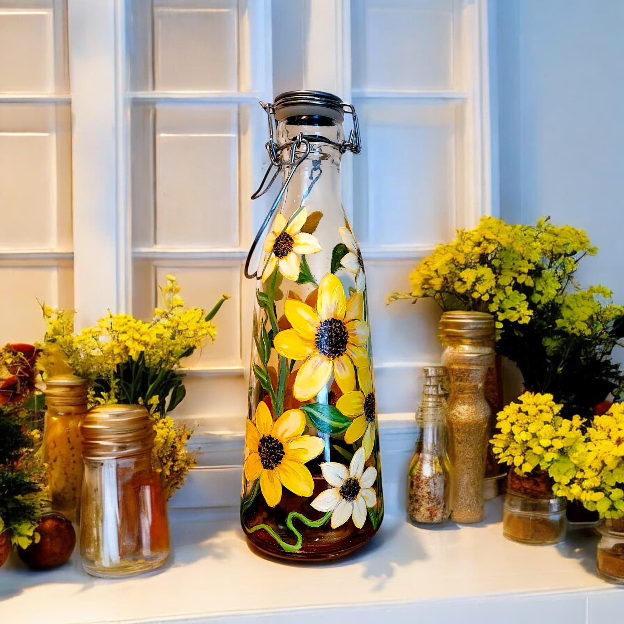 A hand painted floral jar displays a stunning masterpiece, where vibrant flowers and other blooms burst against a clear glass backdrop. Set on a white shelf surrounded by floral and kitchen accents, turning this into a captivating decorative statement.