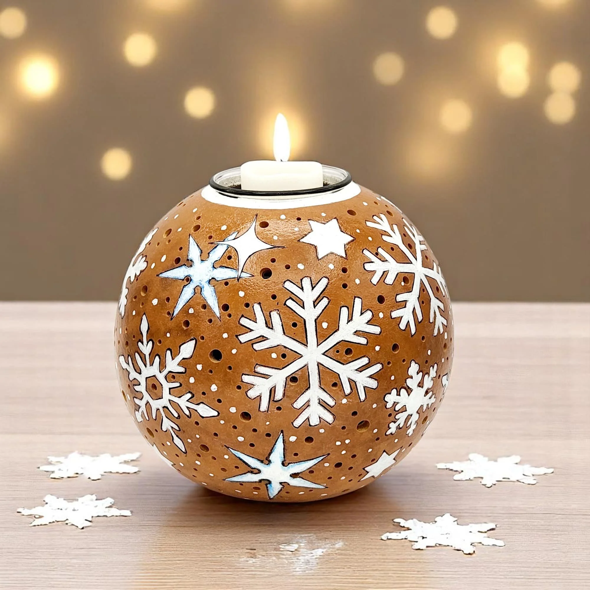 Decorative wood burned and engraved cannonball gourd candle holder with snowflake designs, holding a lit tealight candle, on a wooden surface with blurred lights in the background. The intricate design, etched with care, adds warmth to any space as the flickering candle casts a mesmerizing glow.