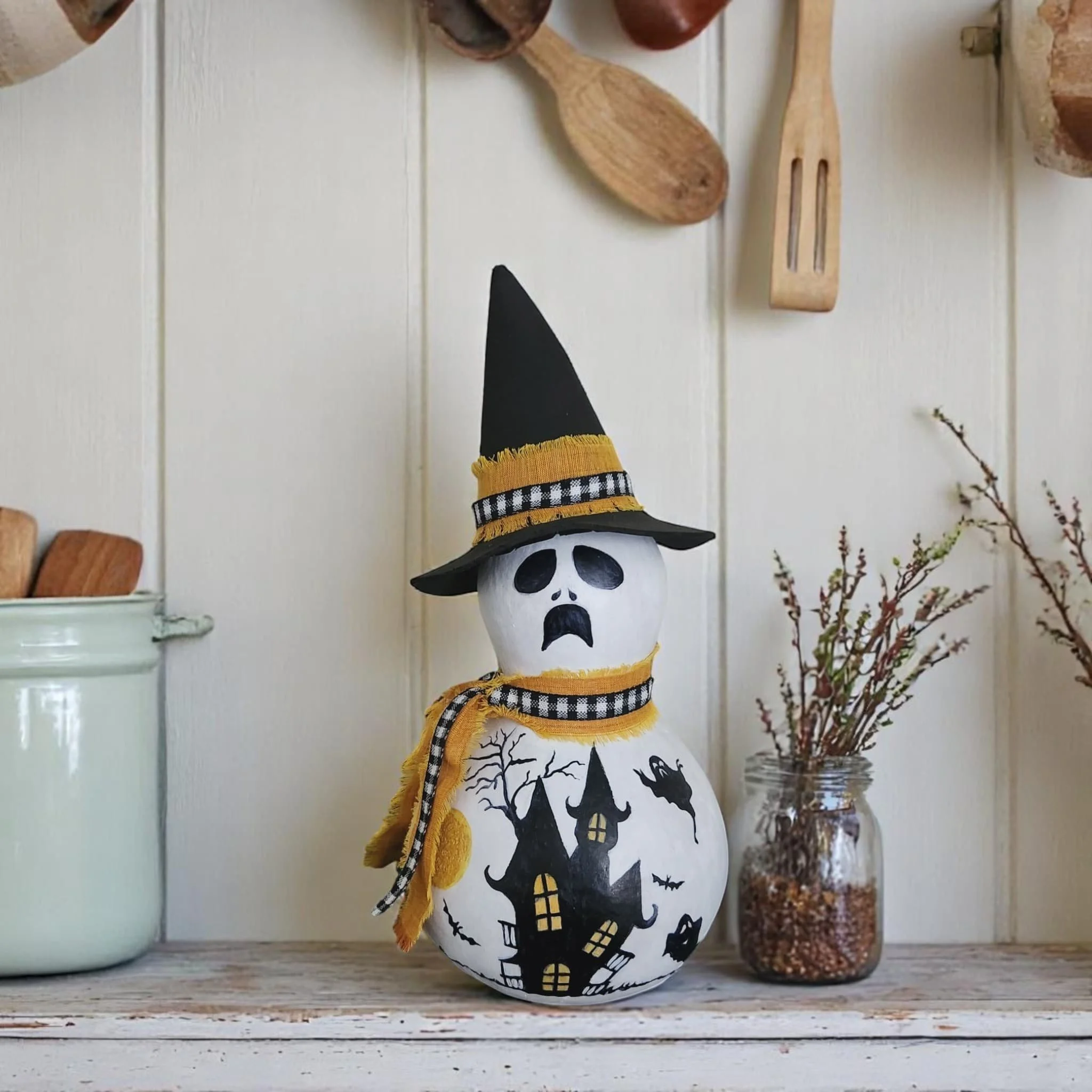 A bottle gourd hand painted as a ghost wearing a pointy black hat showcases a captivating blend of art and Halloween spirit. The black and white design, with a haunting imagery makes it a standout piece. Its unique charm enhances any display, adding a touch of ghostly intrigue.