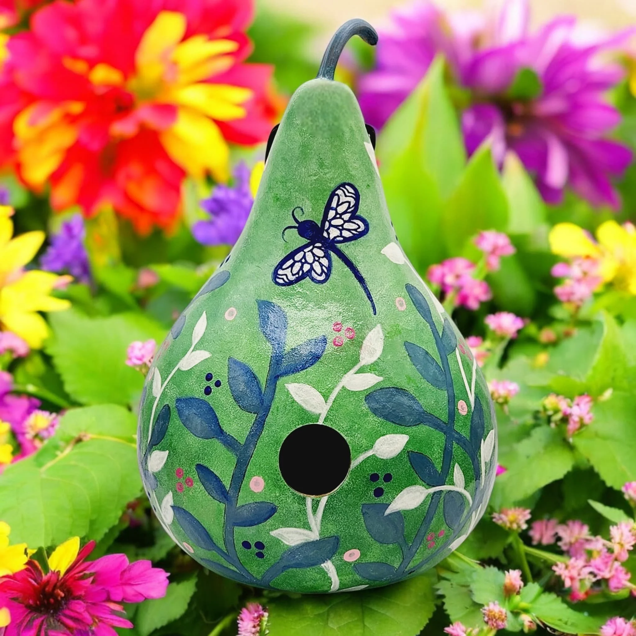 This hand-painted Bottle Gourd birdhouse features vibrant pastel hues, dragonflies, and plants. Sealed for durability, it’s a unique garden accent and perfect gift.