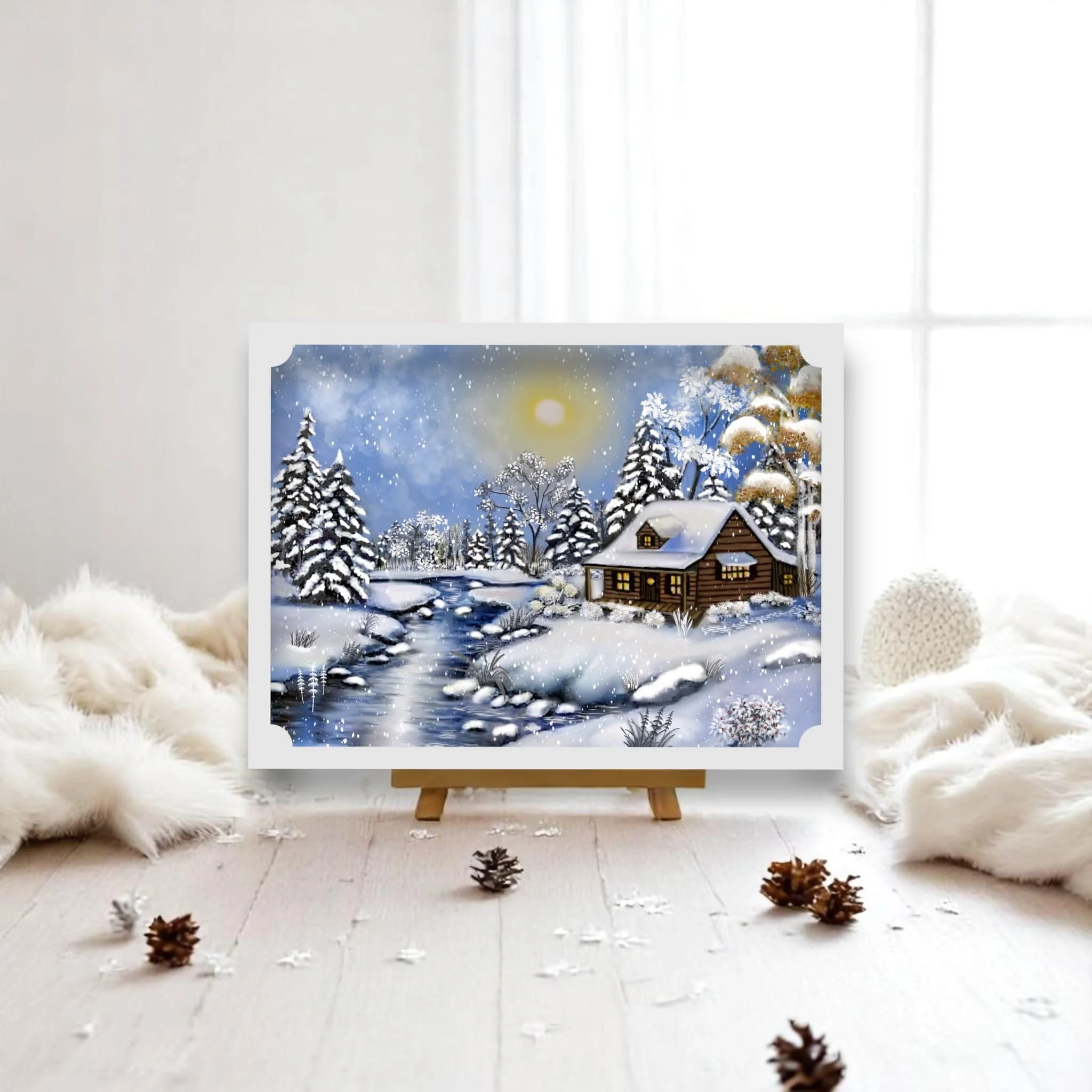 Digital image created from an original acrylic painted by Warwick Arts or a Winter landscape showing a snowy scene with a cabin, trees, and a river. The painting is propped on a wooden stand surrounded by artificial snowflakes and pinecones. Soft, fluffy fabric and a window in the background complete the cozy setting.
