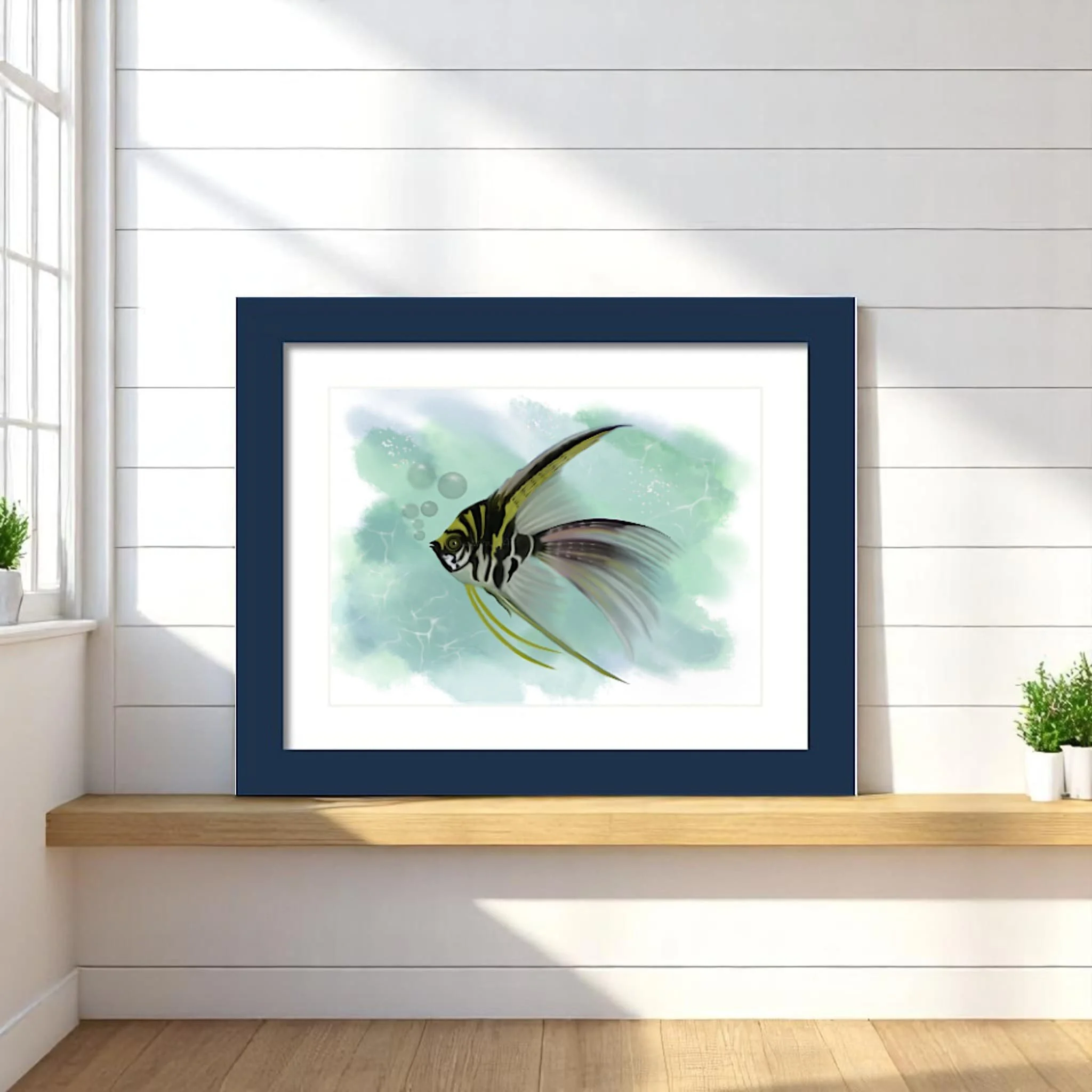 A digital artwork created by Warwick Arts showcases a mesmerizing angelfish painting, skillfully blended in watercolors. The yellow-black striped tail and black finial, rendered digitally, captivate in a serene blue frame. The calming artwork, displayed on a wooden shelf, evokes tranquility with its vibrant colors and tranquil scene.