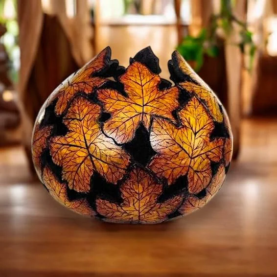 A Wood burned and carved Autumn Leave vase displays a stunning fusion of artistry, where each leaf's intricacy is revealed in its burnt and carved form. The round vase, with a warm, rustic texture, bursts with vibrant orange and yellow hues, embodying the essence of Autumn in every detail.
