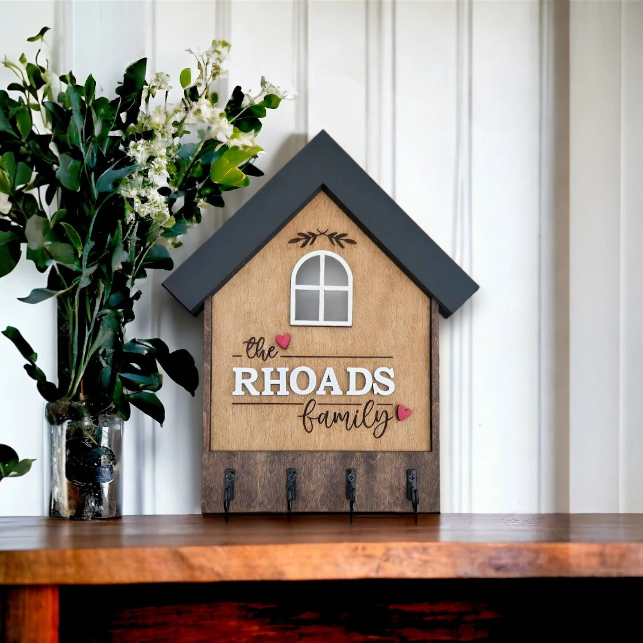 Decorative custom laser-engraved wooden house-shaped keyholder sign with "Rhoads Family" text, beside a vase of white and green flowers, on a wooden table.
