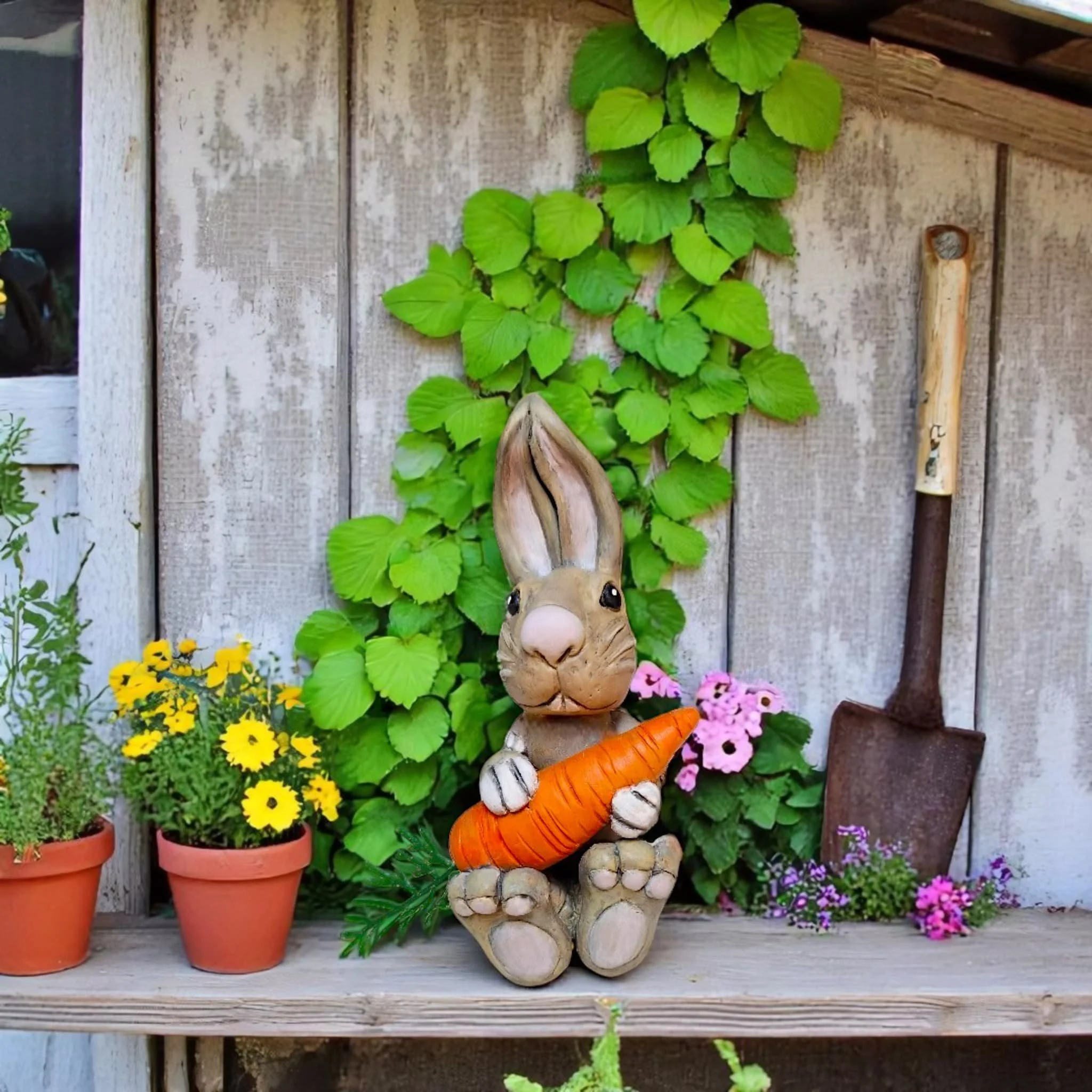 A Polymer clay Rabbit figure displays a delightful, handcrafted charm, with a pliable rabbit holding a tasty carrot in its paws. The soft, round face and vividly detailed ears make this a unique and visually appealing addition to any indoor garden setting.
