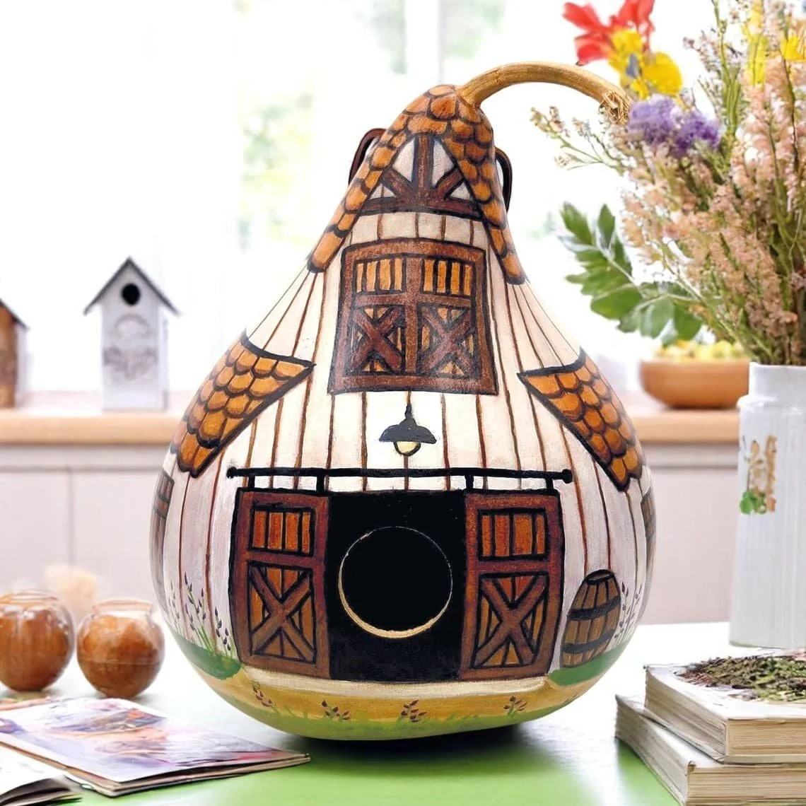 Gourd birdhouse painted to resemble a white barn, with rustic details showcases a delightful, artisanal creation. Its intricate white exterior, adorned with a brown roof and doors, mimics a quaint barn, captivating nature enthusiasts. The gourds pointed top and side window bring life to this charming rustic hideaway.